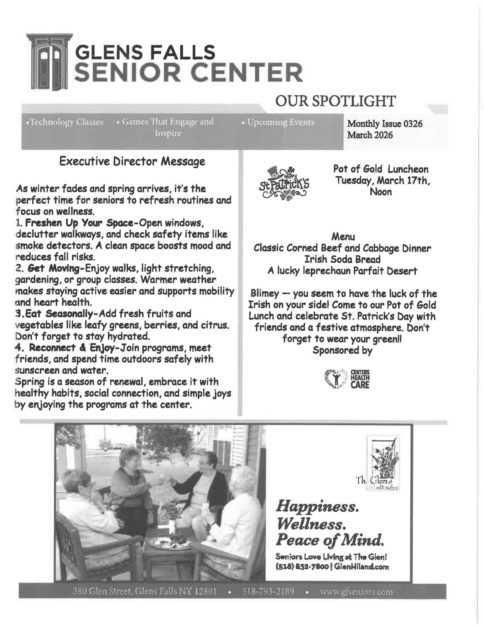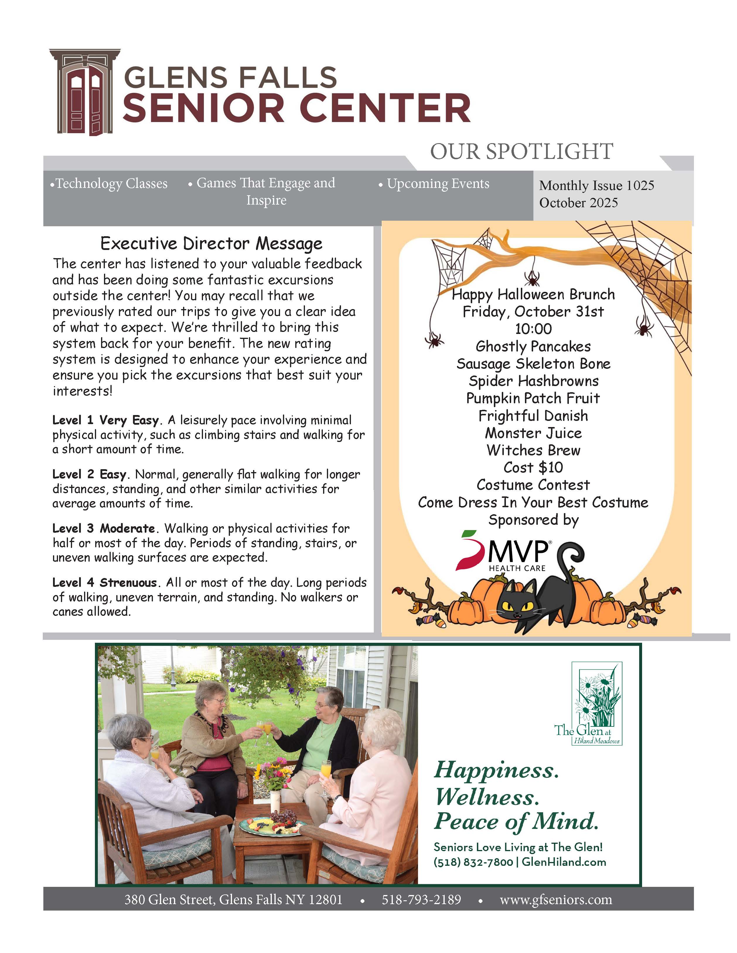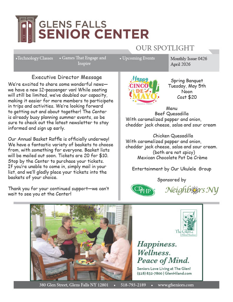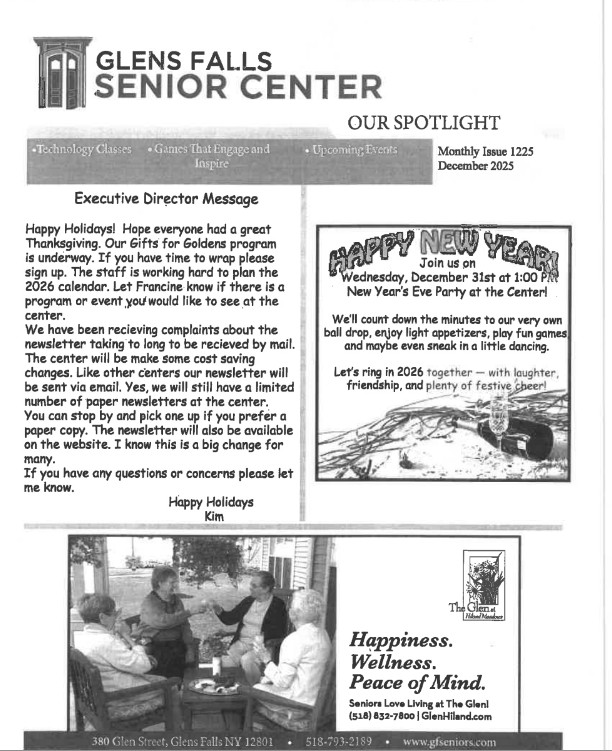 Our Mission: The Greater Glens Falls Senior Citizens Center, Inc. seeks to improve quality of life for those 50 and older in the Greater Glens Falls area by offering a wide range of educational, health, social and recreational related activities and services both at the Center and in the Community.